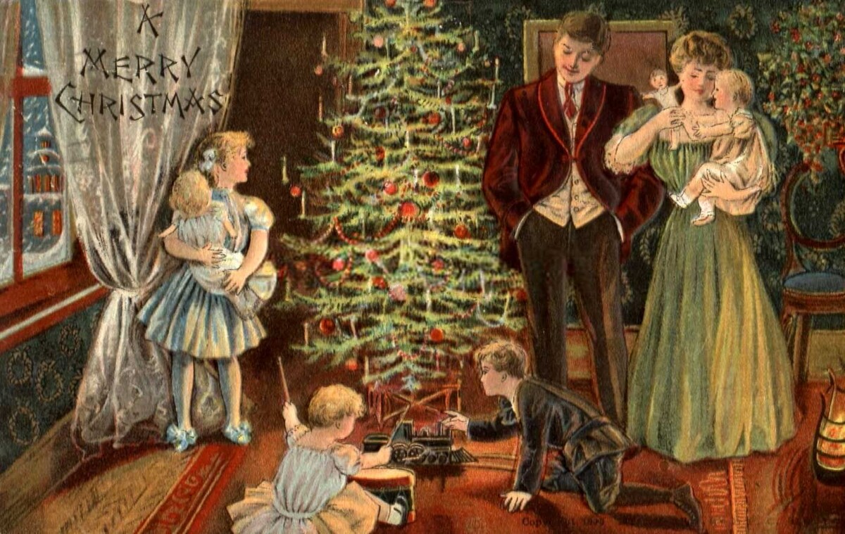 «Рождественские и новогодние открытки создавались лучшими художниками и печатниками. Позже фотографы тоже начали участвовать в этом жанре, добавляя фотографии счастливых семей, детей и сцен религиозных праздников».