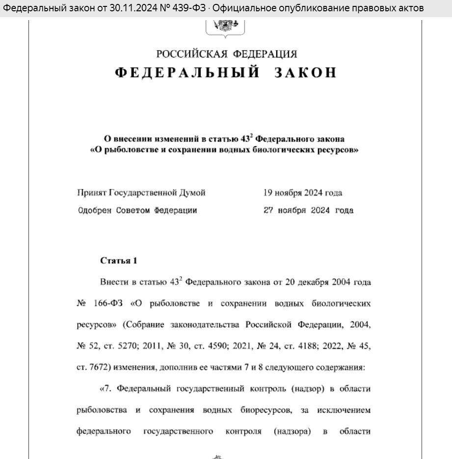 И так, не прошло и четырех лет, как депутаты спохватились, что рыбоохрана в своей основной деятельности чуть ли не вне правового поля находится. Почему? Да потому что в 20 году был принят Федеральный Закон N 248-ФЗ "О государственном контроле (надзоре) и муниципальном контроле в Российской Федерации" , на основании которого в 21 году было принято предусмотренное этим Законом Положение о государственном контроле (надзоре) в области рыболовства и сохранения водных биологических ресурсов. (постановление Правительства Российской Федерации от 25.06.2021 № 996). Вроде бы всё по уму. Закон определяет государственные органы, уполномоченные осуществлять контроль, оговаривает возможные виды и формы контроля, дает определения рискам, при осуществлении контроля, оговаривает гарантии прав контролируемых лиц, и многое другое. Положение, разработанное наверняка специалистами, конкретизирует круг лиц обладающих контрольными полномочиями в области рыболовства, описывает какие конкретно меропр