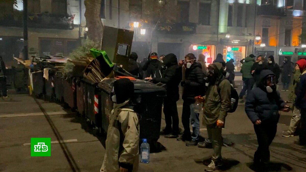 [ Смотреть видео на сайте НТВ ] У здания парламента в Тбилиси вновь начались беспорядки. Вечером в понедельник возле здания парламента в Тбилиси вновь начались массовые беспорядки. Судя по кадрам с места событий, протестующие бросают горящие петарды в бойцов спецназа. Участники протестов стучат по металлическому ограждению, которое установлено у парадного входа, но попыток прорваться внутрь здания не предпринимают. Полицейские охлаждают пыл нарушителей порядка при помощи ледяной воды. К месту оппозиционного митинга в Тбилиси стянули грузовики с водометами. Очередная серия акций протеста оппозиции началась в Грузии в четверг, после того, как премьер-министр Ираклий Кобахидзе заявил о решении приостановить рассмотрение вопроса о начале переговоров по членству страны в Евросоюзе до 2028 года. Парламентские выборы прошли в Грузии 26 октября. По данным ЦИК, правящая партия «Грузинская мечта», выступающая за сохранение отношений с Россией и против антироссийских санкций, набрала 53,93% голос