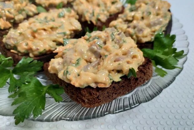 Быстрый способ приготовить вкусную закуску Ингредиенты Сельдь 200 г Морковь 1 штука Плавленый сыр 100 г Петрушка 1 пучок Бородинский хлеб 150 г Лимонный сок по вкусу Молотый черный перец на кончике ножа 1.Подготовить ингредиенты. Морковь очистить, зелень петрушки промыть. 2.Сельдь нарезать мелкими кубиками. 3.Сырую морковь натереть на мелкой терке. 4.Измельчить зелень петрушки. 5.Соединить в миске ингредиенты для закуски. 6.Добавить плавленый сыр без добавок. 7.Хорошо перемешать. 8.Добавить черный молотый перец на кончике ножа. 9.Добавить по вкусу несколько капель лимонного сока. 10.Подрумянить на сковороде бородинский или любой другой хлеб. 11.Нарезать хлеб порционными кусками и положить на них готовую закуску. 12.Выложить на блюдо и украсить зеленью петрушки. 13.Закуску можно сразу подавать к столу.