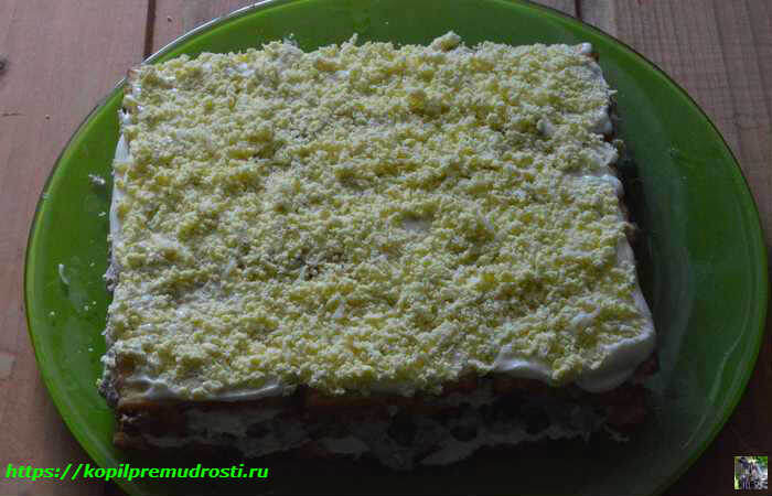 Любая хозяйка постоянно находится в поисках нового рецепта. Главное – чтобы было вкусно, не занимало много времени, а если речь о большом застолье – то еще и не банально. Этот вариант салата пришелся по душе всем. В изначальном рецепте были коржи из дрожжевого теста, но так как их приготовление занимает много времен (хотя и получается вкуснее) – было решено заменить их на крекеры. На приготовление одного торта-салата обычно уходит 1,5-2 пачки. Идеальный вариант – соленое печенье, но, если такового не найти – можно приобрести крекеры с кунжутом или просто без добавок. Консервы также могут быть разными. Я предпочитаю эконом-вариант в виде сайры, но можно купить горбушу или тунец. А вот кильки в томатном соусе лучше избегать. Ингредиенты: Для того чтобы приготовить вкусный торт-салат и приятно порадовать своих родственников, возьмите следующие ингредиенты: Сразу обращу ваше внимание, что приготовление не быстрое. Первый шаг – подготовка ингредиентов. Для этого: 1. Вначале отвариваем яйца