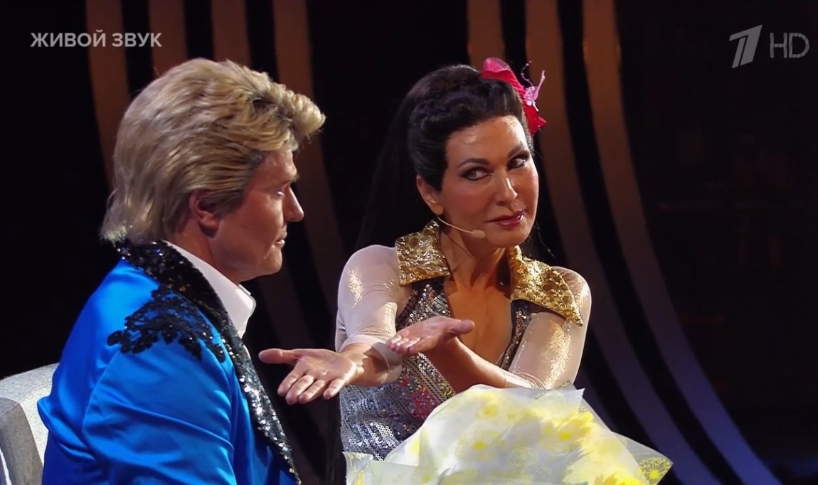 Завершал музыкальную часть концерта (хотя её толком даже и не начинали...) дуэт третейских судей. Они изображали Аль Бано и Ромину Пауэр. Честно говоря – этот выпуск у меня оставил столько негативных эмоций и морально опустошил, что данное выступление я почти никак не воспринял. Лишь Глызина сразу узнал. Выглядел и звучал очень похоже. Данный образ ему как влитой подошёл. Да собственно – это и был тот же Глызин только в очках и парике! Его партнёршей стала некая Александра Воробьёва. Я вообще без понятия – кто это такая? На фоне многих других выступлений – это действительно смотрелось на голову профессиональнее.