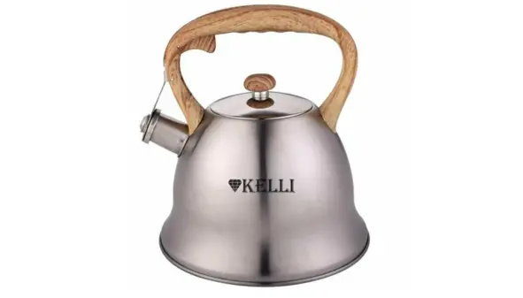 - Kelli предлагает доступные чайники со свистком из нержавеющей стали с объемом 2-3 литра. Бренд популярен благодаря хорошему соотношению цена-качество и практичному дизайну.