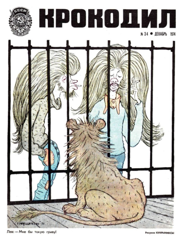 В декабре 1974 года СССР находился в самом зените эпохи разрядки, так что печать спокойно могла уделять внимание всевозможным мелочам. Например, причёскам молодёжи. А как раз в те годы вошли в моду длинные причёски, которые символизировали собой отчасти вольномыслие, отчасти — тягу к хиппованию (в СССР свои хиппи тоже были), отчасти — любовь к западной музыке и культуре. Кукрыниксы. «Лев: — Мне бы такую гриву!» Декабрь 1974