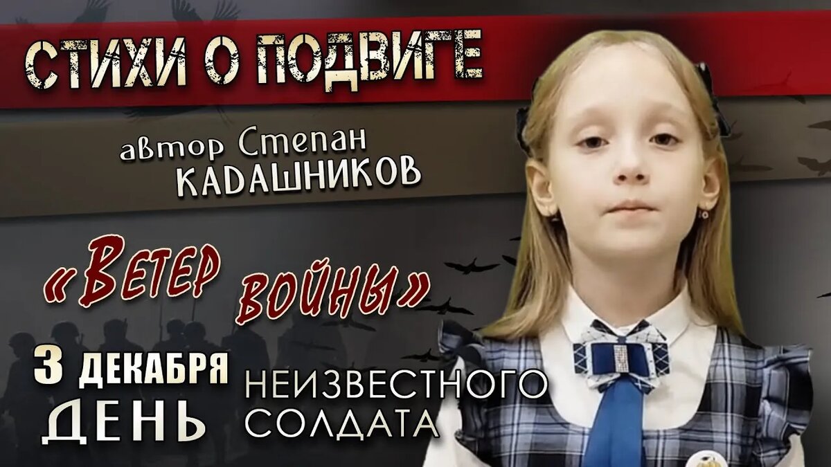 Каждый год 3 декабря в России отмечается День Неизвестного солдата — день памяти тех, кто отдал свою жизнь за Родину, но чьи имена остались неизвестными. Этот день напоминает нам о ценности человеческой жизни и важности памяти о героях, которые сражались на фронтах Великой Отечественной войны и других конфликтах. Подвигу неизвестных солдат посвящено стихотворение Степана Кадашникова «Ветер войны», которое читают дети и школьники из разных городов и сёл России, принимая участия в различных мероприятиях ко Дню Неизвестного солдата. Сегодня хотим рассказать 10 фактов об истории учреждения даты и создания мемориала мемориале "Могила Неизвестного Солдата", а также поделиться частью лучших видео с прочтением стихотворения поэта в исполнении детей и школьников. В рамках празднования этой даты чтение стихов становится значимой традицией, особенно если речь идет о произведениях, написанных о войне. Подвигу неизвестных солдат посвящено стихотворение Степана Кадашникова «Ветер войны». В памятный день, строчки этого стихотворения читают дети и школьники из разных городов и сёл России, принимая участия в различных мероприятиях. В этой статье мы собрали только малую часть лучших прочтений: