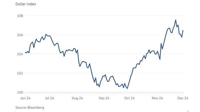 Индекс доллара, показатель курса американской валюты по отношению к шести основным конкурентам, вырос в понедельник на 0.6%. Евро пострадал сильнее других из-за возможного краха французского правительства, но другие основные валюты, включая британский фунт и канадский доллар, также снизились. Рост в понедельник стал очередным этапом мощного ралли доллара, которому способствовала победа Трампа на президентских выборах в прошлом месяце. Инвесторы делают ставку на то, что тарифные планы Трампа будут иметь инфляционный характер, что затруднит снижение процентных ставок для Федеральной резервной системы.
