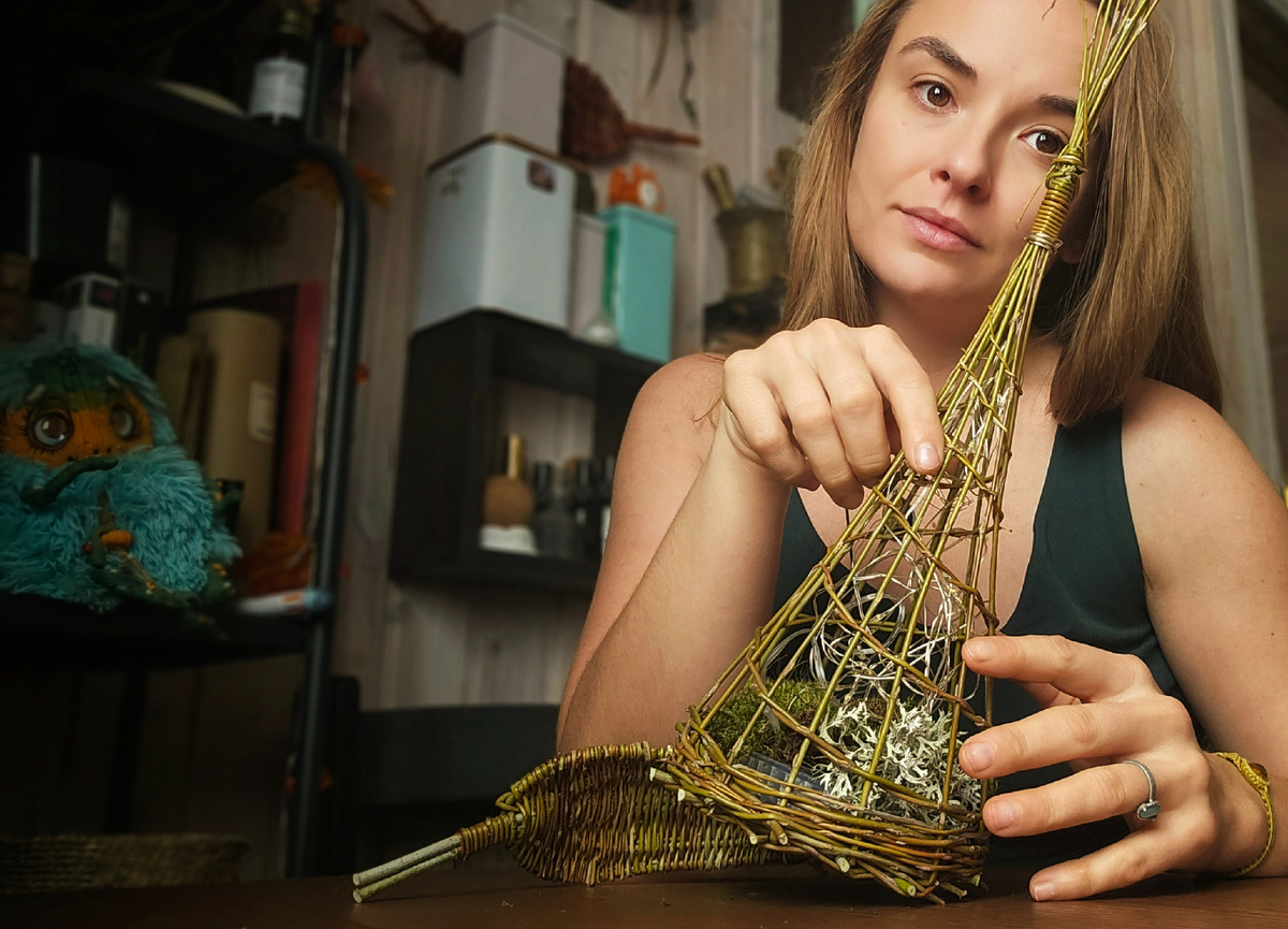 Вдруг вам нужен повод сходить в зимний лес? Пожалуйста! Собираемся за прутиками ивы, дёрена, даже рябина сгодится. Плести будем ёлку, наряжаемую изнутри. Большую или маленькую - решайте сами, но процесс совсем несложный, много времени не займет. Поехали! У меня прутики тонкие были, поэтому и ёлочка будет небольшая. Прутики свежие, но пролежали дома часов 6 после сбора. Берите любые веточки и начинайте плести. Самые тонкие и длинные сразу отложите в сторону - они нам понадобятся для скрепления каркаса. Так выглядят заготовки: Если у вас есть шило - замечательно - аккуратно расщепите три веточки посередине. Если нет - сгодятся и острые ножницы. В отверстие продеваем три веточки, приготовленные для донышка и еще две тонкие - ими будем скреплять конструкцию. Собственно, начало плетения точно такое же, как и у любой корзинки, освоив его, вы легко сможете начать плести что-то более сложное. Двумя веточками проплетаем туго первый ряд. А далее - разводим стоечки в стороны и каждую их них оп