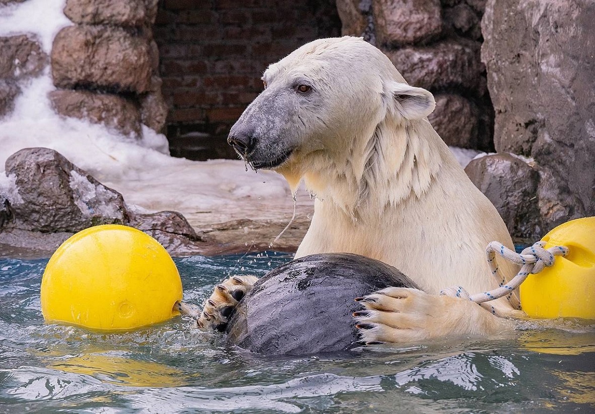 Третьего декабря в «Роевом Ручье» отмечают день рождения Ермака — самому молодому белому медведю парка флоры и фауны исполнилось четыре года.