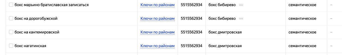 Ко мне недавно обратился клиент с жалобой на бесконечный мусор в ключах. У него небольшая школа бокса в одном из районов Москвы. По моей рекомендации собрал общие забросы с направлениями занятий и запустил на гео по району. И ключи с указанием его района и пары соседствующих - для тех, кто сразу ищет с указанием нужного района.