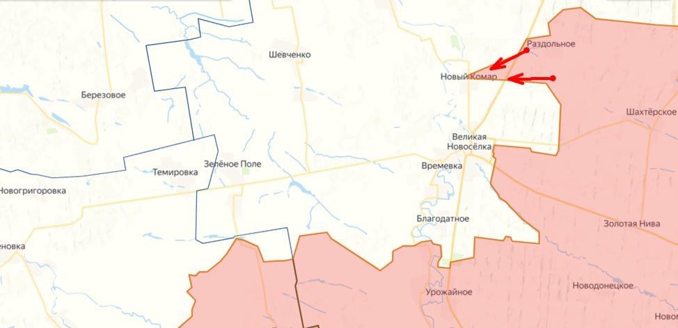 В понедельник, 2 декабря подтвердилась информация о том, что накануне русские штурмовики дерзким рейдом заскочили в населенный пункт Новый Комар, лежащий в пяти километрах севернее Великой Новоселки. "То, что мы будем наступать на Новый Комар, было понятно давно. Удивила лишь скорость, с которой это произошло. Ведь еще на днях обсуждалось закрепление наших сил в Раздольном, расположенном заметно севернее. Теперь же речь идет о том, что воины-дальневосточники берут вражеский гарнизон "за жабры", - сообщает Влад Шлепченко. Если взглянуть на карту, становится ясно, что происходящее – калька с операции, проведенной нашим командованием в августе против Угледара. Тогда коммуникации вражеского гарнизона тоже были перерезаны севернее, ударом на поселок Водяное и штурмом шахт "Южнодонбасская-1" и "Южнодонбасская-3". После этого город был изолирован ударом с юга, перебившим последние коммуникации угледарской группировки в западном направлении. "Сейчас две дороги, ведущие на север, уже перерезан