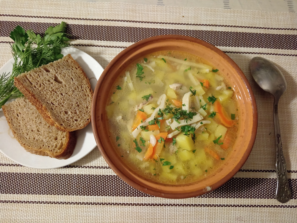 Самый скучный в мире суп можно сделать офигенным! Сварите бульон, да не жалейте мяса куриного на кости! Лучше всего куриные спинки, но у меня были куриные бедра. Теста будет немного, как раз на большую кастрюлю, или на два раза для средней. Нам потребуется: Просеем муку в миску, добавим соль Яйцо размешаем с водой В муку выливаем яйцо, растительное масло, начинаем месить. Лучше сначала вилкой. Теперь надо катать руками. Должен получится такой вот шар. Его раскатать тонко Свернуть в трубочку и тонко нарезать острым ножом. Вот она чудесная лапша! Хоть делали мы теста немного а получилось на два раза. Лапша пусть подсыхает, а мы беремся за суп. Отделяем мясо от костей, режем брусочками картошку , морковь, кубиками лук. Лук и морковь пассеруем на очень малом огне. Картошку высыпаем в бульон. Ждём когда закипит. Самое время все собрать. Наша лапша немного подсохла, берем половину, ломаем помельче, добавляем к картошке, туда же зажарку. Вот такая красотища у нас получилась! И,