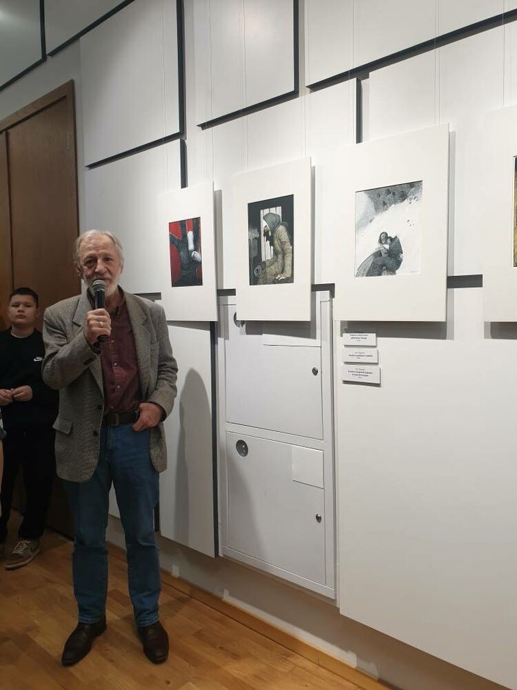 Ещё одна замечательная встреча на казанском книжном фестивале ТАУ. *** У нас не было книг с рисунками Игоря Олейникова. Я, конечно, видела, что художник необычный талантливый, но не проникалась. Это до встречи с ним. Игорь Юрьевич провёл экскурсию по своим работам. Объяснял, что им руководило при их создании. Какой же у него свой оригинальный взгляд даже на классические тексты! Например, кисельные берега из "Гуси-лебеди" - болото из киселя (а фото отдельного нет, извините. Можно разглядеть на общем снимке - три иллюстрации вертикально). Золушка несущаяся потрясающая! Ещё одна Царевна Лебедь в коллекцию. Её метаморфоза вдохновлена... Терминатором. Посмотрите на царевича, выходящего из бочки. Тоже непривычное виденье.