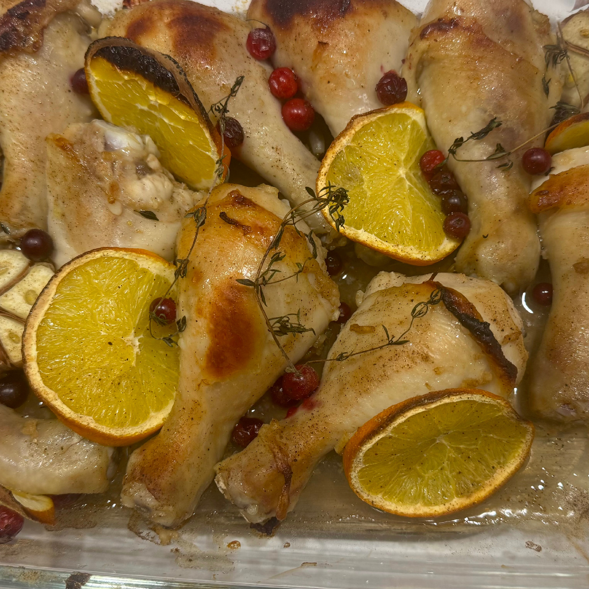 для начала необходимо замариновать голени:выдавливаем сок 1 апельсина, добавляем туда, мёд, соевый соус, оливковое масло и веточку тимьяна, выдавливаем три зубчика чеснока. и оставляем мариноваться, часов на 10-12. выкладываем на противень промаринованные голени, нарезаем второй апельсин колечками и раскладываем равномерно между голени, сверху посыпаем клюквой и веточками тимьяна. Головку чеснока разрезаем напополам и отправляем к ножкам 🙂разогреваем духовку на 180гр, и отправляем туда нашу красоту на 40-59мин. Приятного аппетита 😋