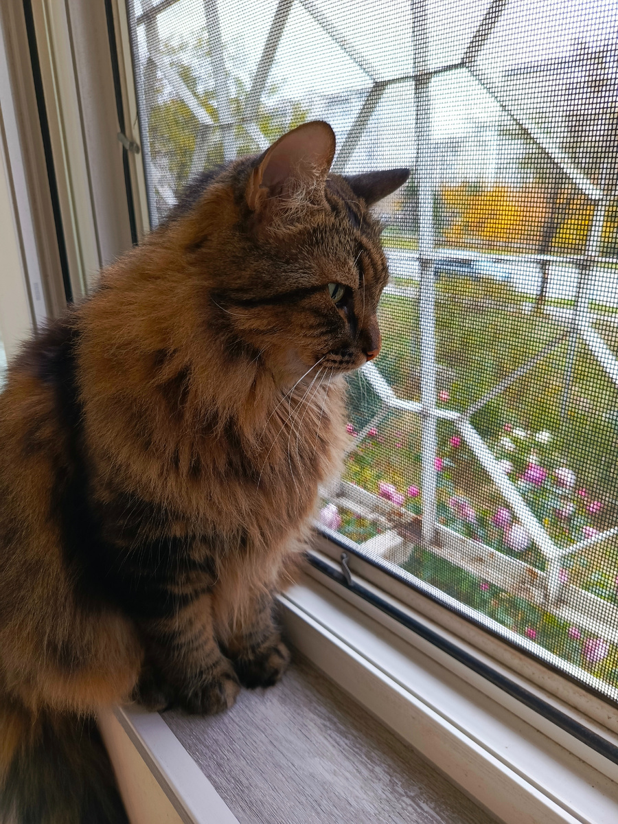 Всем привет! С вами Кузя Кусалочкин и сегодня я расскажу как напряг хозяйку и покажу забавную фоточку. Утро началось как обычно - мне дали паштет. А вот дальше всё пошло не по плану. Паштет этот есть я не стал. Позже подходил, лизал, но не ел. Хозяйка уже начала переживать почему это я не ем. Ведь я когда заболел, то первым признаком было то, что я отказывался есть. Но в остальном я был активный, веселый и игривый. Даже на балконе бдил, наблюдал что там происходит. Так я проходил почти пол дня голодный, пока хозяйка не сообразила мне креветок сварить. С каким аппетитом я их поел. И ушел спать. Завернулся на похолодание: В итоге хозяйка забыла мне таблетку дать после еды. Рада была, что я хоть что-то поел. Пока я спал, хозяйка поработала немного, а потом решила заняться цветами. Возможно, вы и сами замечали на фотографиях, что цветы на окне жутко разрослись и им уже места не хватает в горшках и сами они выглядят не очень хорошо. Вот хозяйка всё привела в порядок, отрезала лишнее, расс
