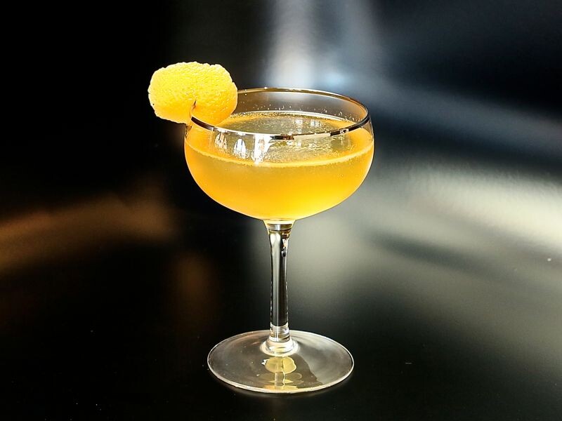 Ингредиенты: Джин — 30 мл Вино — 30 мл Ликер апельсиновый — 30 ст. л. Белок яичный — 15 мл Сок лимонный — 25 мл Биттер — 1 мл Лёд — по вкусу Приготовление: 1. Влить в шейкер джин, ликер, аперитивное вино, лимонный сок и половину белка одного яйца. Взбить. Затем добавить лёд и взбить снова. 2. Перелить через стрейнер в бокал и украсить пену каплями биттера. Приятного аппетита!