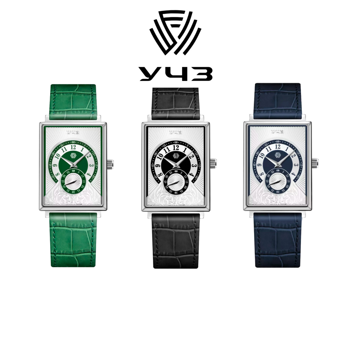 Циферблат многоуровневый, и обладает сложной фактурой. От центра к краю идут три круга основного циферблата — синий, с логотипом УЧЗ, серебристый с арабскими цифрами, обозначающими часы, и еще один синий, с поминутной разметкой с пятиминутными акцентами, который обрамлен не широким серебристым кантом. Вокруг основного циферблата расположилось серебристое гильяше.