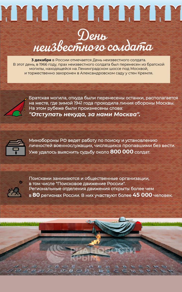 День неизвестного солдата отмечается в России 3 декабря. Именно в этот день в 1966 году прах неизвестного солдата пенесли из братской могилы в Подмосковье и захоронили в Александровском саду у стен Кремля. Братская могила, откуда были перенесены останки неизвестного солдата, располагается на месте, где зимой 1941 года проходила линия обороны Москвы во время Великой Отечественной войны. На этом рубеже были произнесены слова: "Отступать некуда, за нами Москва". День неизвестного солдата как праздник появился в российском календаре в 2014 году. Отмечать памятную дату предложили участники поисковых движений. День неизвестного солдата – это не только день памяти погибших в годы Великой Отечественной войны, но и дата, которая объединяет всех погибших и пропавших без вести во время войн и военных конфликтов.