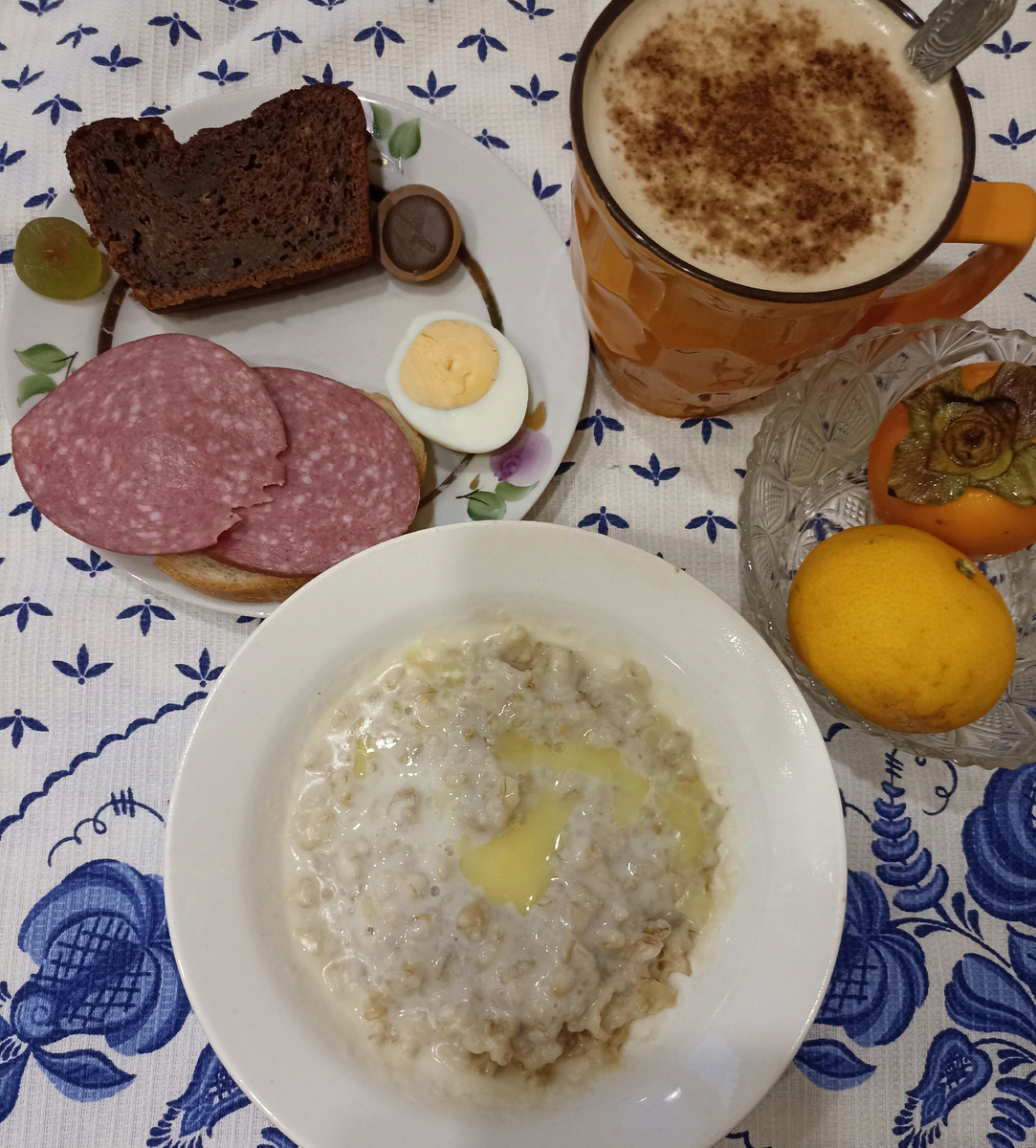 На завтрак была овсяная каша с маслом, бутерброд с сыром и колбасой, половинка яйца, кекс шоколадно-банановый, мармеладка, конфетка, хурма и мандарин, кофе.