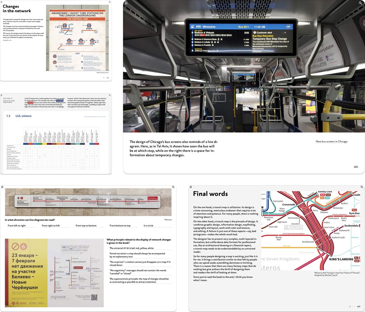 The chapters about designing for changes in transit networks, electronic maps, and standardization. Also the sample chapter ‘Bends’ is available for free The final three chapters of Ilya Birman’s book Designing Transit Maps are out. The chapters are ‘Changes in the network’, ‘Electronic maps’, and ‘Standardization’. The book speaks of transit maps history, important principles of their design, and how they evolve together with their networks. The author talks about techniques: plotting the lines, denoting the stops, choosing the fonts, and composing the final poster. Few designers have an occasion to design a subway map. But the principles and techniques discussed are applicable to any tasks of complex information display: org charts, family trees, control‑flow diagrams, fire escape plans, military operation plans, project timelines, architectural drawings. The book sharpens the reader’s eye and inculcates attention to detail. The chapter explores common changes to a transportation sys
