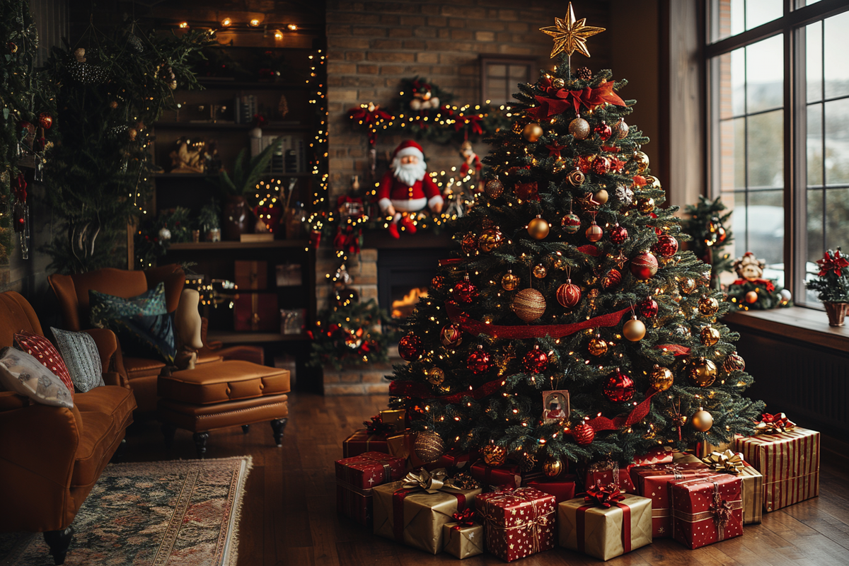 Эта ёлка украшена в традиционных красно-золотых цветах. Игрушки, банты и звезда на макушке создают уютную праздничную атмосферу. Идеально подходит для создания праздничного настроения. Символизирует уют, тепло и семейные традиции. Красный и золотой — цвета радости и богатства.