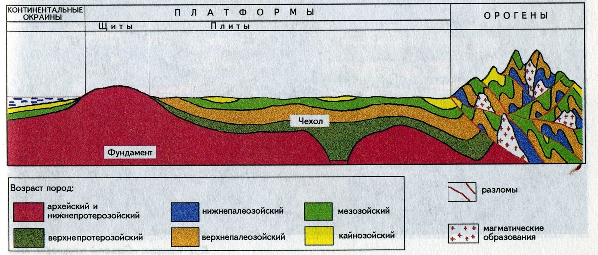 Кристаллический фундамент платформ представляет собой нижний структурный слой тектонических плит, состоящий из магматических и метаморфических пород.