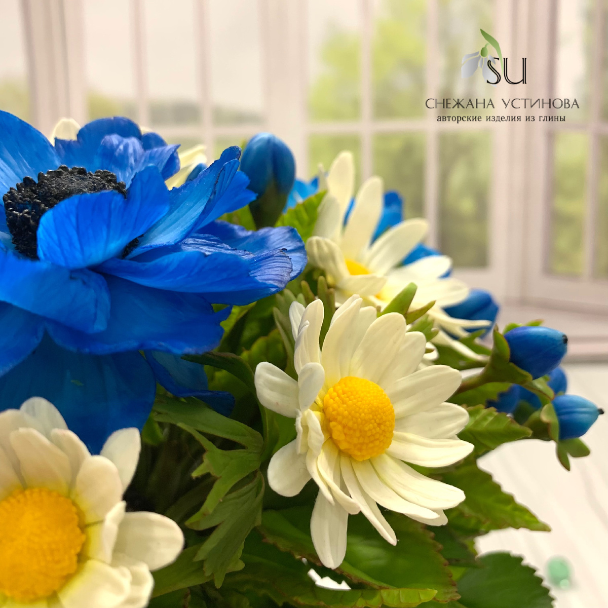 Создание моей композиции "Афродита" началось в тот день, когда мне захотелось чего-то необычного и утонченного. Я задумала букет, который ассоциировался бы с нежностью и грацией этого мифологического персонажа. Подумав о цветах, которые могли бы отразить эту задумку, я остановила свой выбор на голубых анемонах и белых ромашках, добавив к ним синие бутоны для контраста и зелень для завершенности облика. Процесс создания длился около месяца, но, поверьте, это были не просто долгие недели, а настоящее творческое приключение. Начался он с формирования каждого лепестка из холодного фарфора. Этот материал, который я обожаю за его пластичность, требует терпения и внимательности. Каждая деталь должна была быть точной — работа ошибкам не прощала. Но самое интересное начиналось тогда, когда я приступала к тонированию. Ожидание того, как масляные краски на каждом лепестке будут играть в лучах света, заставляло сердце биться немного быстрее. Ах, тонирование - это как идеальная финальная примочка