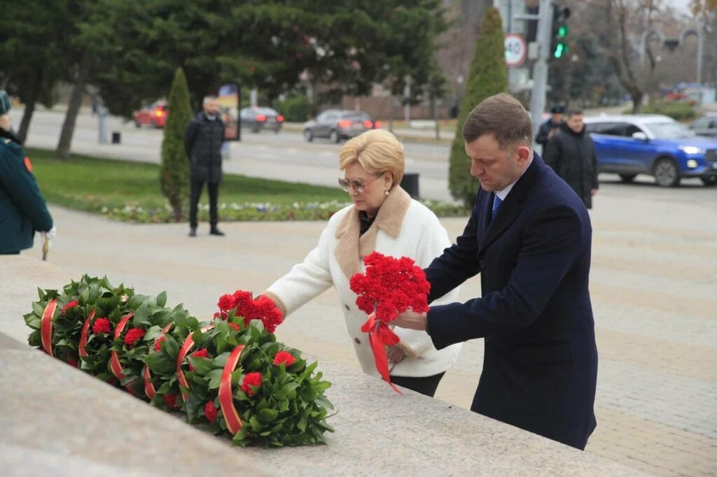 Евгений Наумов и Вера Галушко почтили память героев Великой Отечественной войны минутой молчания и возложили цветы к мемориальному комплексу.