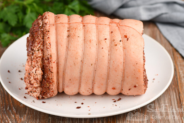 Обвязка рулета завершена. Получается хорошо зафиксированный, красивый рулет, который готов к приготовлению.