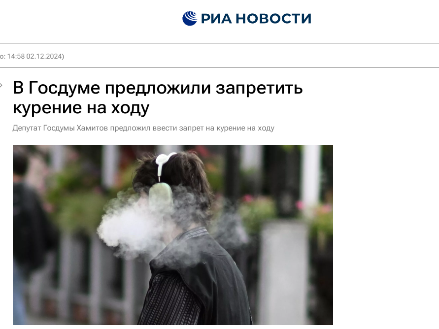 Когда же уже запрет дышать без разрешения? Госдума, кажется, перешла в режим "Ни дня без скандальных инициатив". Не успели россияне отойти от скандальных заявлений депутата Госдумы про "рожалки" и обзывательства на женщин, как подоспели новые идеи. Заместитель председателя комитета Госдумы по спорту Амир Хамитов (партия "Новые люди") предложил министру здравоохранения Михаилу Мурашко запретить курение на ходу. Об этом пишет государственное информационное агентство "РИА Новости". Судя по логике Хамитова, именно в проблему россиян, которые курят, когда идут, уперлась проблема чистоты и "приятности для проживания" наших городов. "Запрет курения на ходу сделает города более чистыми и приятными для проживания. Помимо этого, запрет будет способствовать снижению распространения курения среди молодежи. <…> Прошу Вас рассмотреть данное предложение и определить позицию министерства с точки зрения возможности законодательного внесения поправки в закон "Об охране здоровья граждан от воздействия т