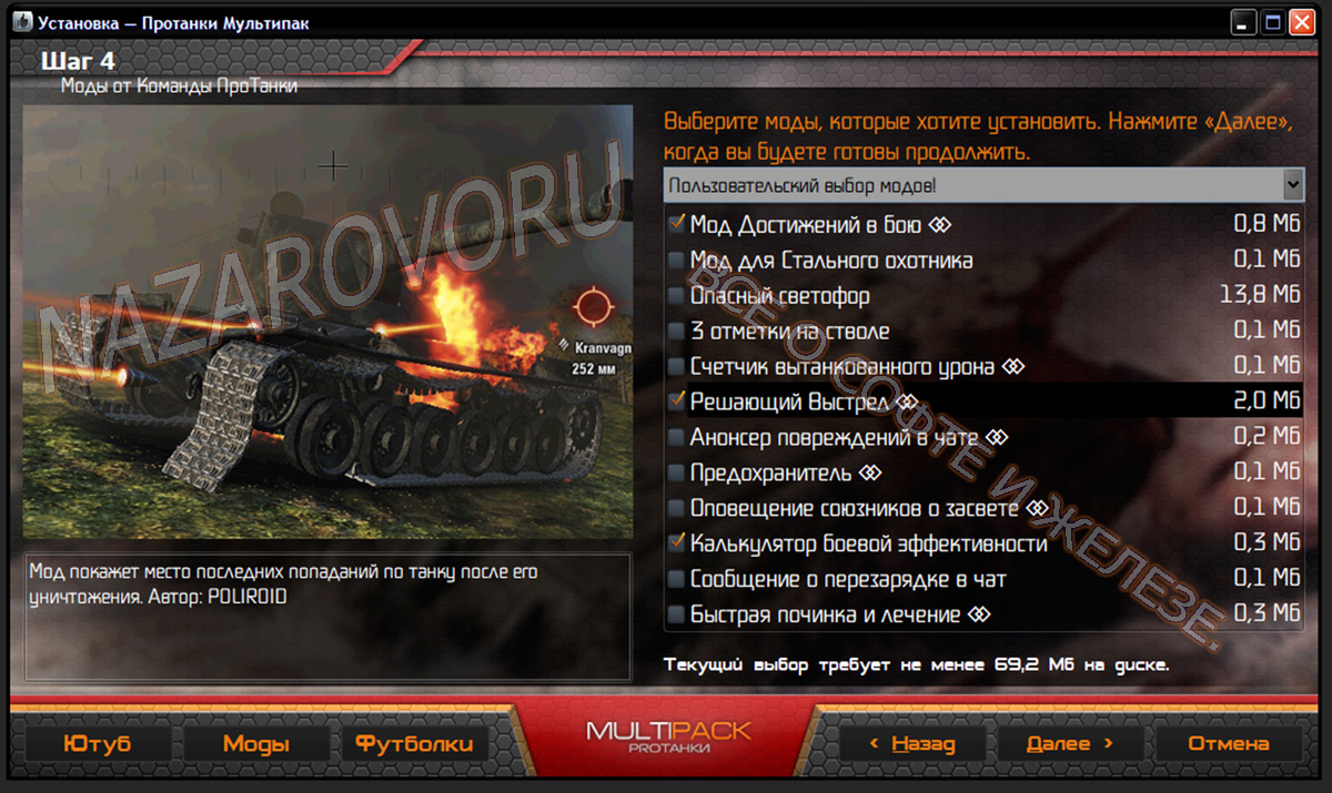 Наибольшее количество дополнений содержит раздел боевых модов, среди которых можно найти дамаг панели, прицелы, зоны пробития, счетчики собственного урона, измененны