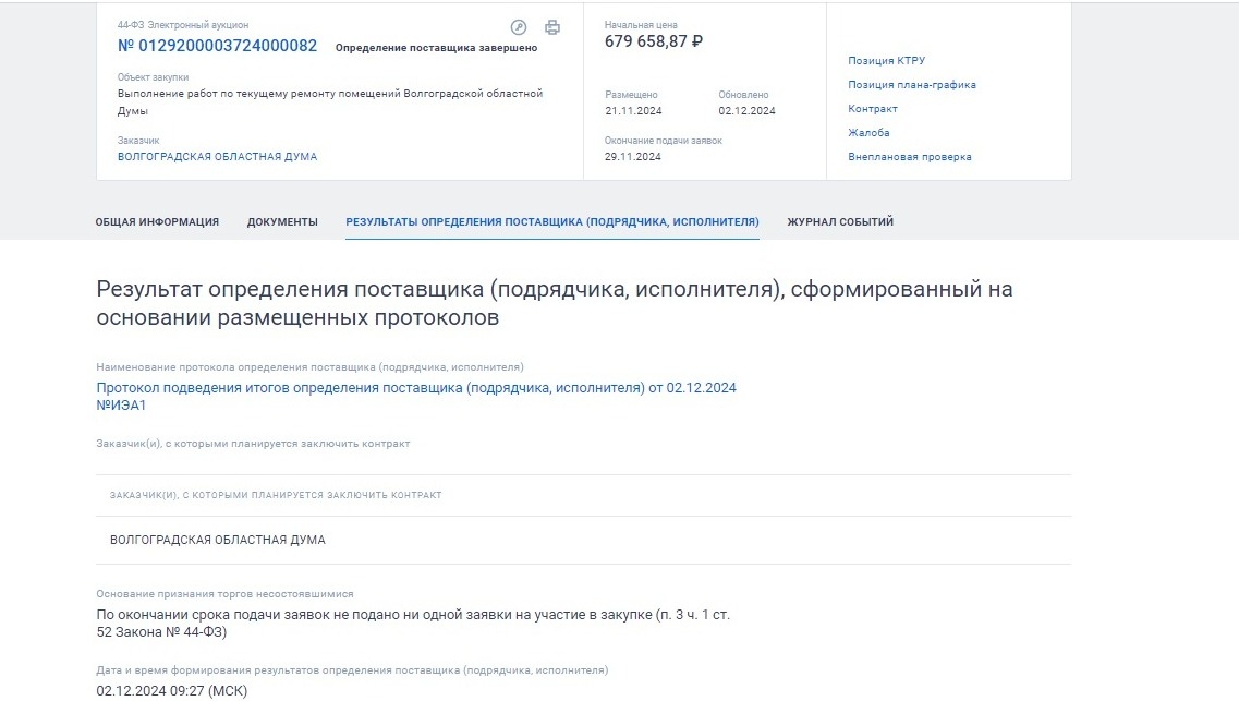 — По окончании срока подачи заявок не подано ни одной заявки на участие в закупке (п. 3 ч. 1 ст. 52 Закона № 44-ФЗ), — сообщается о грустных итогах закупки в информационной карточке, где обычно должны указываться результаты определения поставщика или исполнителя контракта.