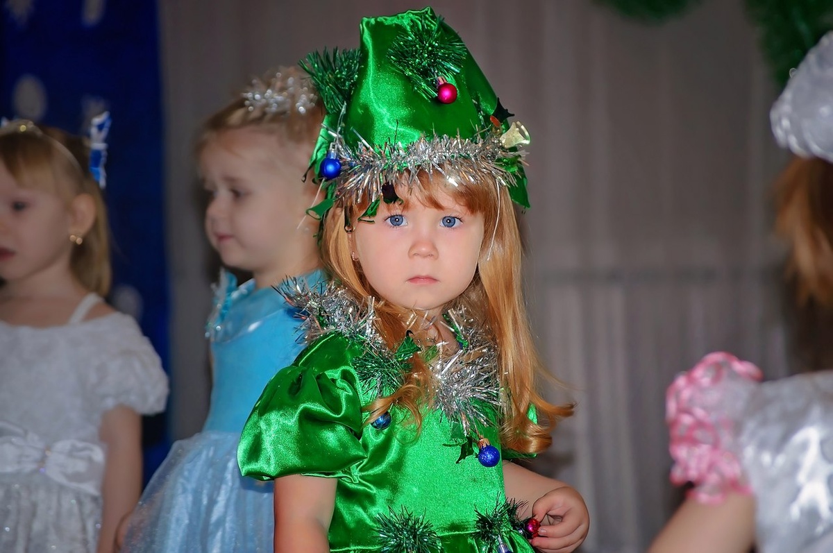 У хорошей мамы-репортера еще до начала праздника есть парочка фотографий. Это может быть нарядная елка без людей вокруг, детали украшения зала, выглядывающие из-за занавеса мордашки, родители и т.д. Но есть несколько специфических моментов новогоднего празднества. Во-первых, это момент переодевания, когда наши Тани, Кости, Ани превращается в мышек, Буратин и снежинок.