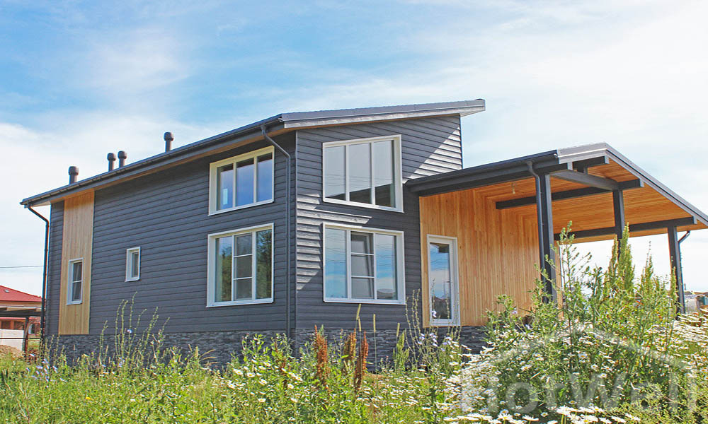 — Внешняя отделка: Произведена компанией «Хотвелл», в качестве отделочного материала использовался фиброцементный сайдинг cedral. Монтаж велся по системе вентфасад.