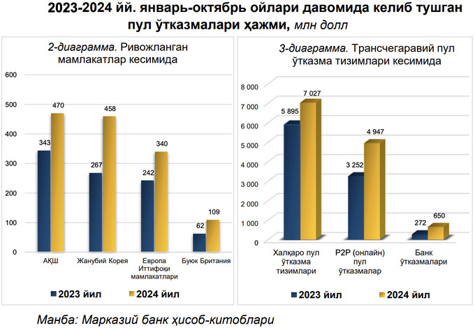 В период с января по октябрь текущего года объём денежных переводов в Узбекистан составил 12,6 миллиарда долларов, что на 34% больше, чем за аналогичный период прошлого года, следует из отчёта Центрального банка. Согласно данным регулятора, 78% всех поступлений, или 9,8 миллиарда долларов, пришлось на Россию, что на 35% больше, чем в прошлом году. Переводы из Казахстана составили 699 миллионов долларов, из США — 470 миллионов долларов (рост на 37%), из Южной Кореи — 458 миллионов долларов (рост на 71%), из Турции — 331 миллион долларов, из Великобритании — 109 миллионов долларов (рост на 76%). Переводы из стран Евросоюза составили 340 миллионов долларов (рост на 41%). Увеличение объёма международных переводов в Узбекистан в 2024 году связано с ростом экономической активности и уровня заработной платы в странах, принимающих трудовых мигрантов, а также с увеличением масштабов миграции в развитые страны. Через традиционные международные системы денежных переводов в Узбекистан поступило 7