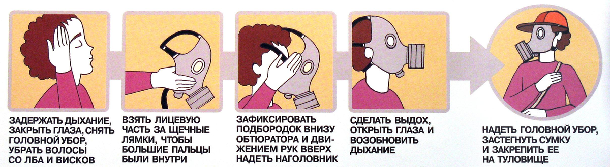 Соблюдение правильной техники надевания обязательно, так как задержка дыхания и закрытые глаза защищают от воздействия токсичных веществ, а резкий выдох помогает удалению загрязненного воздуха из-под маски.