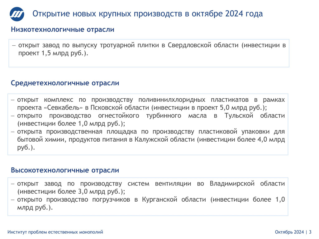 Расчет индексов основывается на косвенных интегральных показателях, которые отличаются высокой достоверностью и оперативностью – потребление электроэнергии и погрузка грузов на железнодорожном транспорте. Согласно исследованию Института проблем естественных монополий индекс ИПЕМ-производство в октябре 2024 года вырос на 2,7% относительно октября 2023 года (+4,4% за период январь – октябрь 2024 года). Индекс ИПЕМ-спрос в октябре 2024 году вырос на 2,2% относительно октября 2023 года (+3,1% за период январь – октябрь 2024 года). В октябре 2024 года «Кургандормаш» запустил новую производственную площадку, на которой наладили серийный выпуск погрузчиков: ТЕРМИТ-1000, МЭП-1000, ММП-1500, КЗДМ-206. Фото: телеграм-канал губернатора Курганской области Вадима Шумкова. В основу расчета индекса промышленного производства (ИПЕМ-производство) заложен тот факт, что электроэнергия является средством производства для любого промышленного процесса. Индекс рассчитан на основе данных об электропотреблени