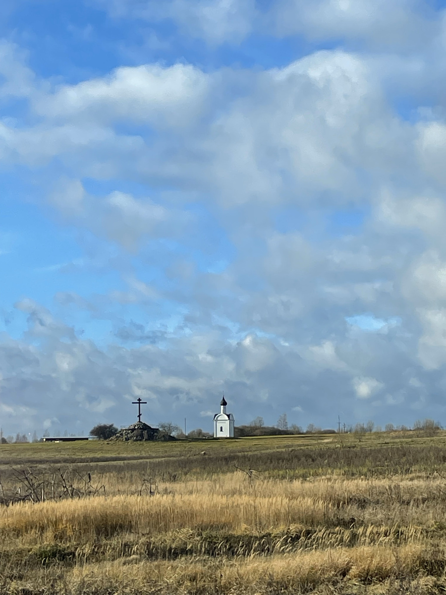 Когда мы выехали из Изборска, то недалеко от трассы заметили часовню и высокий деревянный крест. Это был мемориальный комплекс «Священный холм единения России». Мы не стали подъезжать к нему, так как день был расписан почти по минутам. Но я узнала о нём по дороге.