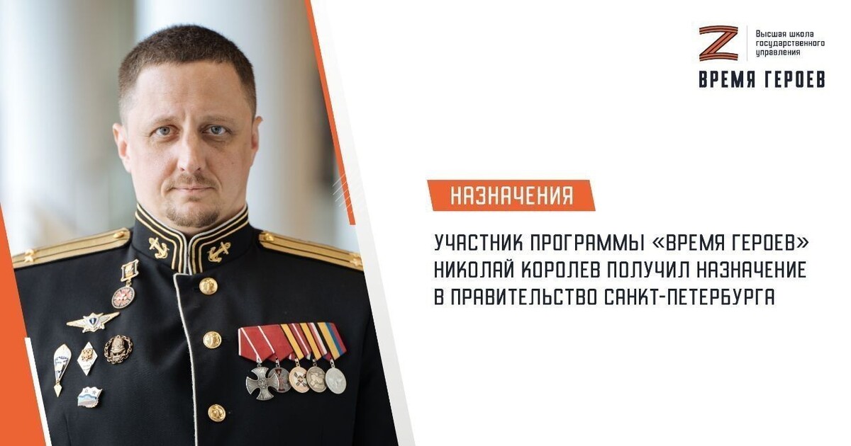 Капитан 2-го ранга кавалер ордена Мужества и участник первого потока программы «Время героев» Николай Королев назначен заместителем председателя Комитета по вопросам законности, правопорядка и безопасности Правительства Санкт-Петербурга. В мае текущего года он стал одним из 83 участников программы, инициированной Президентом России Владимиром Путиным и реализуемой Высшей школой государственного управления Президентской академии. Его наставником стал губернатор Санкт-Петербурга Александр Беглов. В ходе стажировки под руководством губернатора Николай Королев получил приглашение занять должность в правительстве города. «Программа «Время героев» предоставляет уникальную возможность для участников обучиться новым навыкам и продолжить служение Родине», – отметил Николай. Он подчеркнул, что полученные знания от опытных профессионалов помогли ему иначе взглянуть на управление городом и то, что такая форма обучения способствует раскрытию управленческого потенциала. Николай Михайлович Королев ро