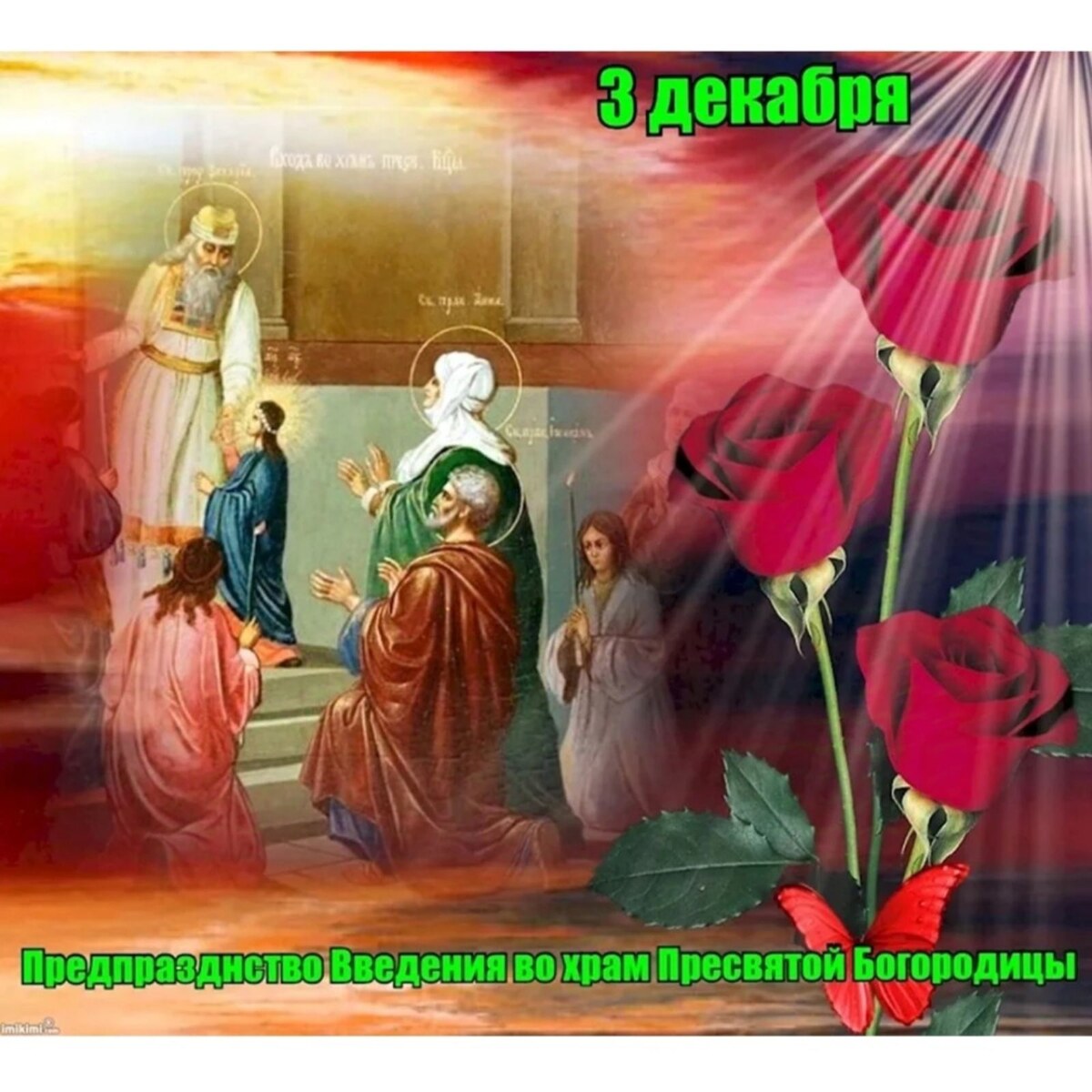 Праздник Введение Девы Марии во Храм отмечается 4 декабря (по новому стилю) Это двунадесятый праздник. 3 декабря предпразднство Родители Девы Марии, праведные Иоаким и Анна, молясь о разрешении неплодства, дали обед, если родится дитя, посвятить его на служение Богу. Когда Пресвятой Деве исполнилось три года, святые родители решили выполнить свое обещание. Собрав родственников и знакомых, одев Пречистую Марию в лучшие одежды, с заженными свечами в руках, с пением священных песней привели Ее в Иерусалимский храм. В храм вела лестница в пятнадцать ступеней Младенец Мария не смогла бы Сама взойти по этой лестнице. Но как только Её поставили на первую ступень, укрепляемая силой Божией, Она быстро преодолела остальные ступени и взошла на верхнюю. Затем первосвященник по внушению Свыше, ввел Пресвятую Деву в Святое святых, куда из всех людей только раз в году входил первосвященник с очистительной жертвенной кровью. Все присутвовавшие в храме дивились необыкновенному событию . Праве