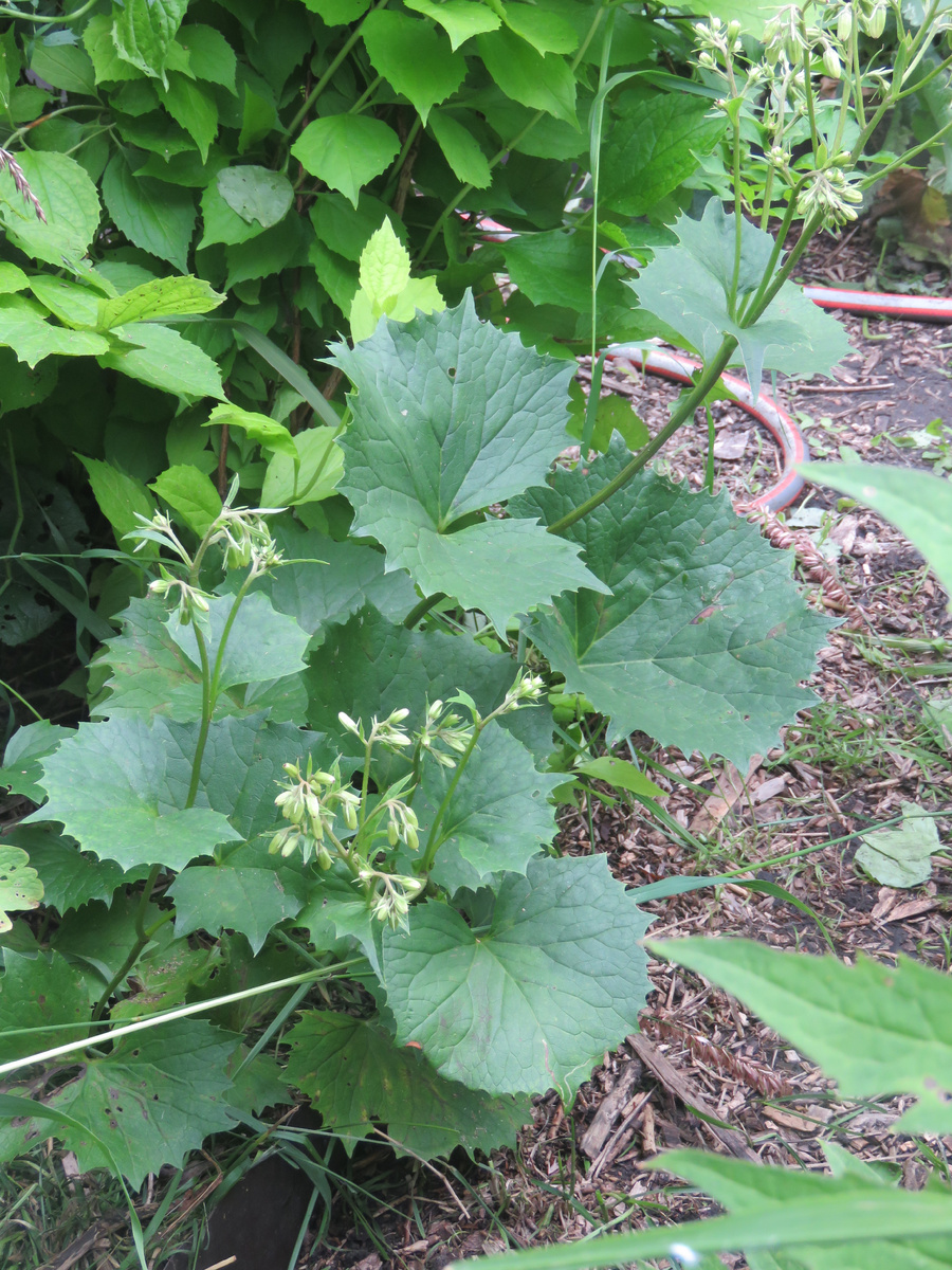 Нарезая круги по "Саду Бонсай" (который совсем не бонсай) в пятый или шестой раз в восторженном экстазе почти неофита, впервые узревшего взрослое, ранее им невиданное в таком размере растение, я возопила (догадайтесь, почему со мной семья и друзья не любят такие места посещать?): да ты ж моя какалия!! Вот ты какой, северный олень! На тот момент вот это, что на фотографии, изображало из себя один лист в фазе прирастания на новом месте. Какалия (она ж недоспелка) толи ушастая, толи ушковая, а так auriculata, завелась у меня после того, как я узнала про ее сестрицу - борцоволистную. И слово "какалия" (читать с придыханием) стало символом несбыточного желания. Ну, где одна в хотелках, то уже и две в наличии. На самом деле, кроме крупной листвы и подлескового местоположения, дева сия из Приморского края ничем похвастаться не может. Это именно тот немножечко "японский" случай, когда играемся только зеленым цветом и формами. Ибо цветение тут.. Типа так. В августе. Как и все любители подлеск