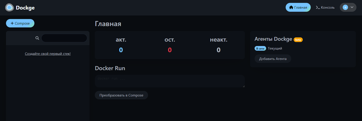 В прошлой части мы поставили на сервер Docker, Fastpanel и Dockge. Теперь давайте развернем хостинг и сервис в Docker. Для примера возьмем востребованный контейнер с Vaultwarden (хранилище паролей). На начальном этапе, в Dockge нет сервисов. Для установки Vaultwarden, идем на GIT тыц. На странице находим "Docker Run", строку установки сервиса. Копируем. Вводим эти строки в конвертер. Да, порт 80 у нас занят для Fastpanel, поэтому его надо отстроить на другой. Я использовал 9999. Теперь жмем кнопку - Преобразовать в Compose. Кстати, мы могли бы ввести сразу compose.yaml с GIT. Для этого копируем с сайта строки yaml файла. Нажимаем кнопку +Compose в интерфейсе Dockge, открывается файл примера для установки nginx. Затираем строки примера и вносим свои. Порт конечно тоже меняем. Теперь жмем - Развернуть, и получаем рабочий контейнер с менеджером паролей. Для проверки, заходим по адресу http://IP:9999 и видим, что наш сервис в работе. Теперь для нормальной работы сервиса, развернем его чер