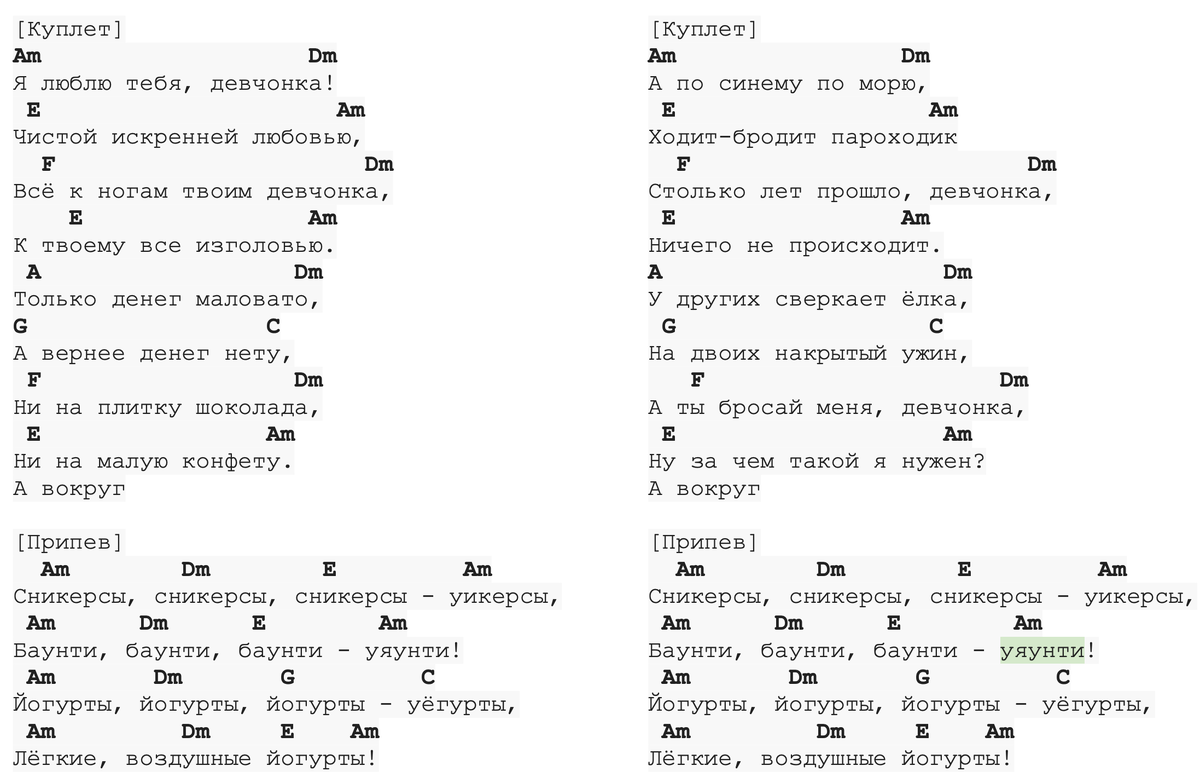 [Куплет] Am Dm Я люблю тебя, девчонка! E Am Чистой искренней любовью, F Dm Все к ногам твоим девчонка, E Am К твоему все изголовью. A Dm Только денег маловато, G C А вернее денег нету, F Dm Ни на плитку шоколада, E Am Ни на малую конфету. А вокруг [Припев] Am Dm E Am Сникерсы, сникерсы, сникерсы - уикерсы, Am Dm E Am Баунти, баунти, баунти - уяунти! Am Dm G C Йогурты, йогурты, йогурты - уёгурты, Am Dm E Am Легкие, воздушные йогурты! [Куплет] Am Dm А по синему по морю, E Am Ходит-бродит пароходик F Dm Столько лет прошло, девчонка, E Am Ничего не происходит. A Dm У других сверкает елка, G C На двоих накрытый ужин, F Dm А ты бросай меня, девчонка, E Am Ну за чем такой я нужен. А вокруг [Припев] Am Dm E Am Сникерсы, сникерсы, сникерсы - уикерсы, Am Dm E Am Баунти, баунти, баунти - уяунти! Am Dm G C Йогурты, йогурты, йогурты - уёгурты, Am Dm E Am Легкие, воздушные йогурты!
