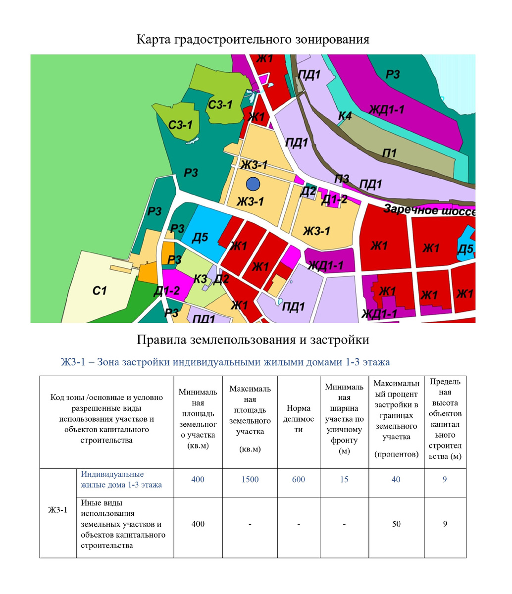 Любые кадастровые работы (уточнение границ, раздел, образование земельных участков и др.) начинаются с определения минимальных и максимальных размеров земельных участков в установленной Правилами землепользования и застройки (далее – ПЗЗ) территориальной зоне. ПЗЗ являются результатом градостроительного зонирования территории – разделения на территориальные зоны с установлением для каждой из них градостроительного регламента. В каждой территориальной зоне установлены свои предельные размеры земельных участков. Для того, чтобы узнать минимальные и максимальные размеры земельного участка, необходимо на карте градостроительного зонирования определить территориальную зону, а далее следует посмотреть в ПЗЗ предельные размеры земельного участка. Рассмотрим пример, земельный участок расположен в зоне Ж3-1 – Зона застройки индивидуальными жилыми домами 1-3 этажа, где минимальные предельные размеры составляют 400 кв.м., максимальные – 1500 кв.м. ЛЮБЫЕ кадастровые действия начинаются с определен