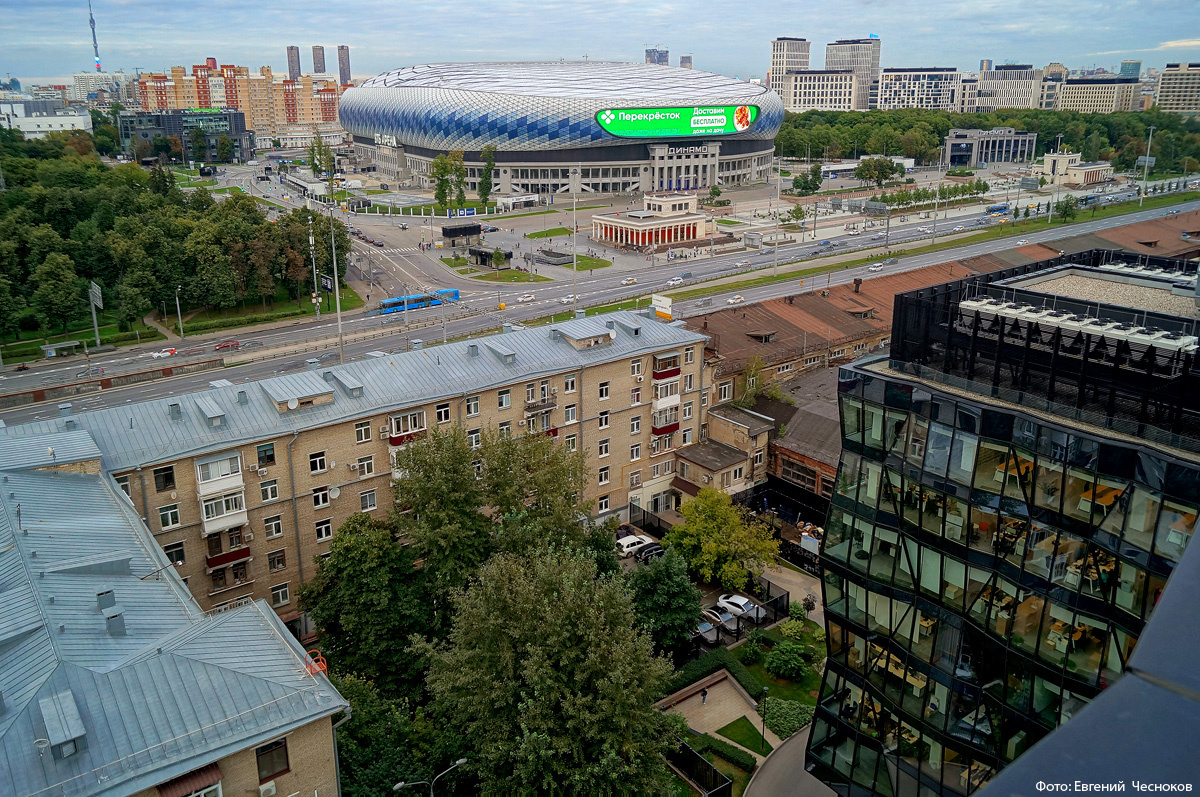 С верхних этажей открываются панорамные виды на Петровский путевой дворец, стадион «Динамо», а все южные окрестности пока заняты корпусами закрывшегося авиационного завода «Знамя труда».