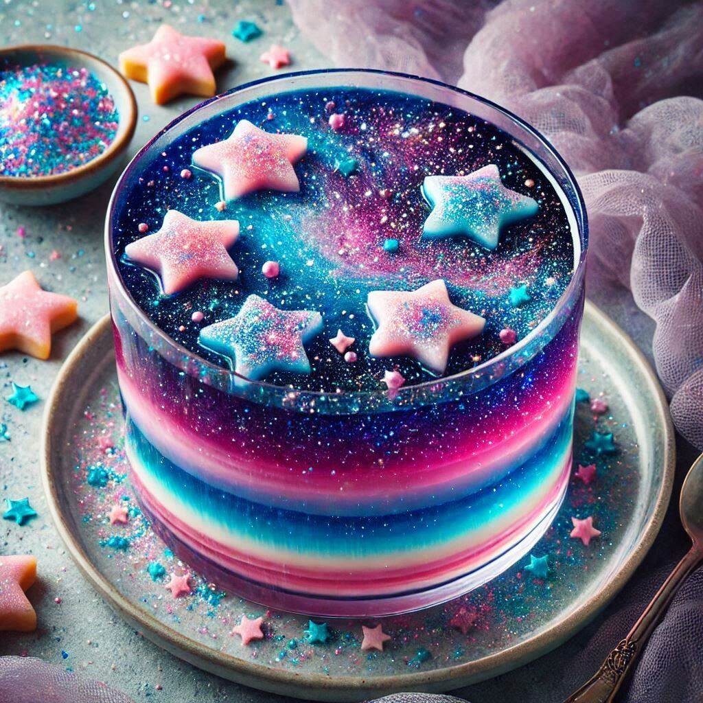 5. Вылейте в форму слоями, охлаждая каждый слой. Используйте ложку, чтобы аккуратно “растянуть” границы слоёв для создания космического эффекта.