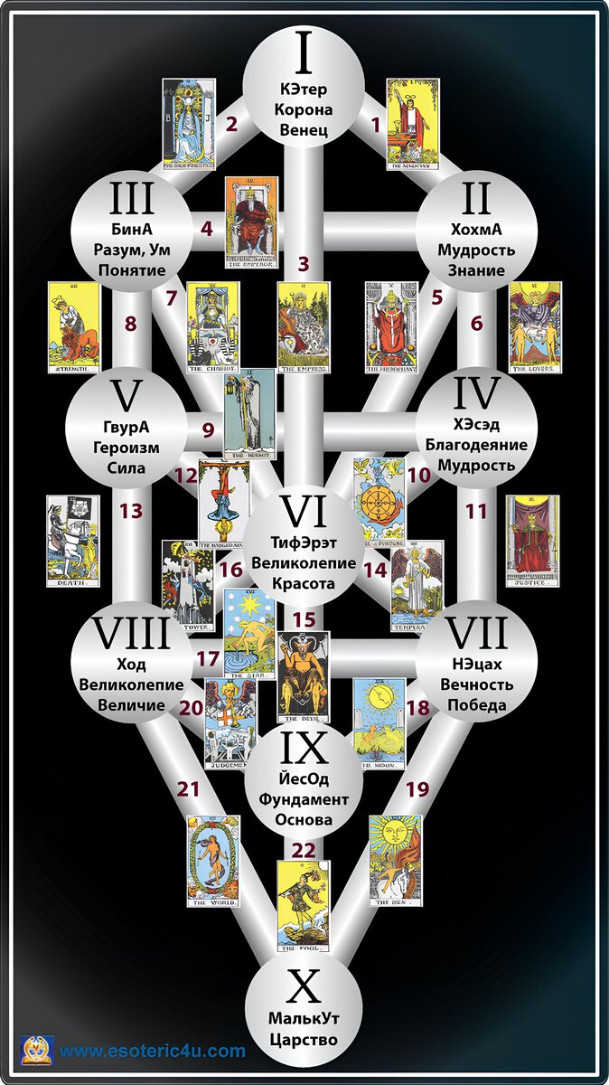 Все карты с числом 7 в Таро связаны с сефирой Нецах на Древе жизни. Нецах переводится как "Победа" и символизирует мужской аспект силы. Она находится у основания Столпа Силы и отвечает за энергию, движение вперёд и попытки удержать достигнутое.