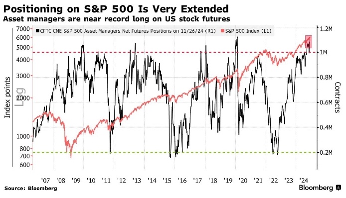 Позиционирование фьючерсов по S&P 500 «совершенно однобоко»: Citi. Разрыв с Европой увеличивается, где настроения остаются медвежьими. По словам стратегов Citigroup Inc., любители коротких позиций капитулируют, поскольку индекс S&P 500 продолжает достигать рекордных максимумов и готовится к своему лучшему результату с 2021 года, в то время как позиции по европейским акциям остаются медвежьими, что еще больше увеличивает разрыв между двумя рынками. Позиционирование инвесторов по фьючерсам S&P 500 «совершенно однобоко», написали в заметке стратеги во главе с Крисом Монтегю . Он «устанавливает новые максимумы четвертую неделю подряд, и все больше удерживающих шортов капитулируют», — заявили они. Количество лонгов у спекулянтов по S&P 500 зашкаливает. Управляющие активами имеют почти рекордную длинную позицию по фьючерсам на акции США. Чистые фьючерсные позиции на 26.11.24 (R1) Индекс S&P 500 (L1). Источник: Блумберг Интерес покупателей к акциям США не показал никаких признаков ослабления