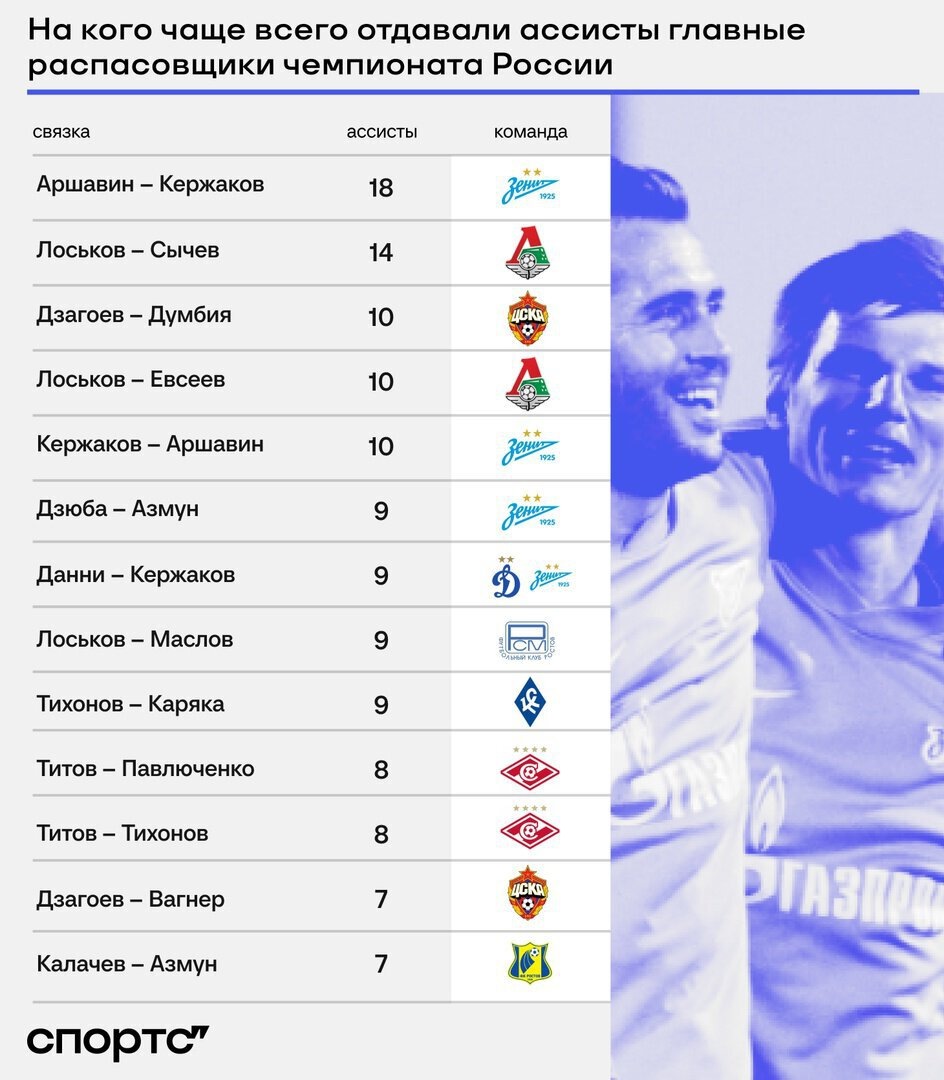 Спортс’’ и «Спорт-Экспресс» провели совместное исследование, чтобы унифицировать подходы к подсчету голевых передач в чемпионате России. Александр Дорский и Гоша Чернов проверили данные лучших ассистентов чемпионата России, а также пересмотрели ассисты Александра Кержакова. Андрей Аршавин отдал Александру Кержакову 18 голевых передач. Связка бывших игроков «Зенита» – лучшая в истории чемпионата России по числу результативных пасов. При этом Кержаков 10 раз ассистировал Аршавину, это третий результат (наравне со связками Дзагоев – Думбия и Лоськов – Евсеев). На втором месте идет связка Дмитрия Лоськова и Дмитрия Сычева: лучший ассистент в истории чемпионата России 14 раз сделал голевую передачу на бывшего форварда «Локомотива». Дзюба или Лоськов – кто рекордсмен по «гол+пас»? Исторический подсчет Спортса’’ и «СЭ» Лоськов со 135 голевыми пасами – лучший ассистент чемпионата России после пересчета Спортса’’ и «СЭ». Дзюба – 2-й, Аршавин – 3-й, Тихонов – 4-й У Дзюбы 245 очков по «гол+пас» в