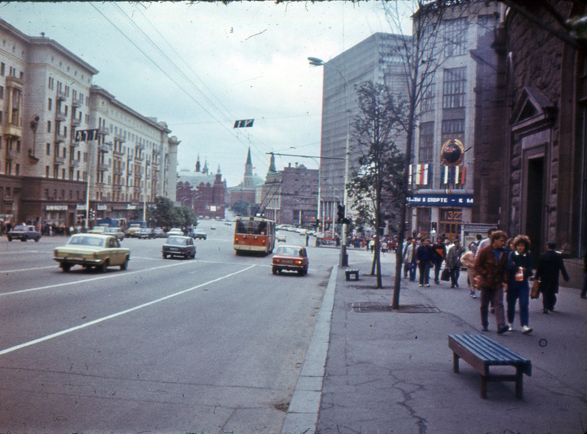 Давайте совершим очередное путешествие сквозь время, прогуляемся по волнам нашей памяти, вспомним, как тогда жил город и посмотрим, что изменилось за прошедшие десятилетия. Поехали! ... На фото улица Горького, ныне Тверская, уходящая к площади 50-летия Октября, которой также вернули старое название - Манежная. Здесь всегда было оживленно, потому что работало много разных магазинов и кафе, коих в других районах не так много было. Кстати, у меня в памяти почему-то не отложилось, что здесь стояли скамейки, но они оказывается были. Фото 1986 года Вид с этой точки за прошедшие годы слегка изменился, в 2015 году здесь расширили тротуары, теперь вместо одной полосы движения растут деревья, а всё пешеходное пространство выложено плиткой. Ещё из кадра исчезла высотная гостиница "Интурист", на её месте теперь комфортабельный отель, своей архитектурой гораздо лучше вписывающийся в окружающую застройку А это улица Москвина уходящая к Петровке, где стоит Высоко-Петровский монастырь. Такая типичная