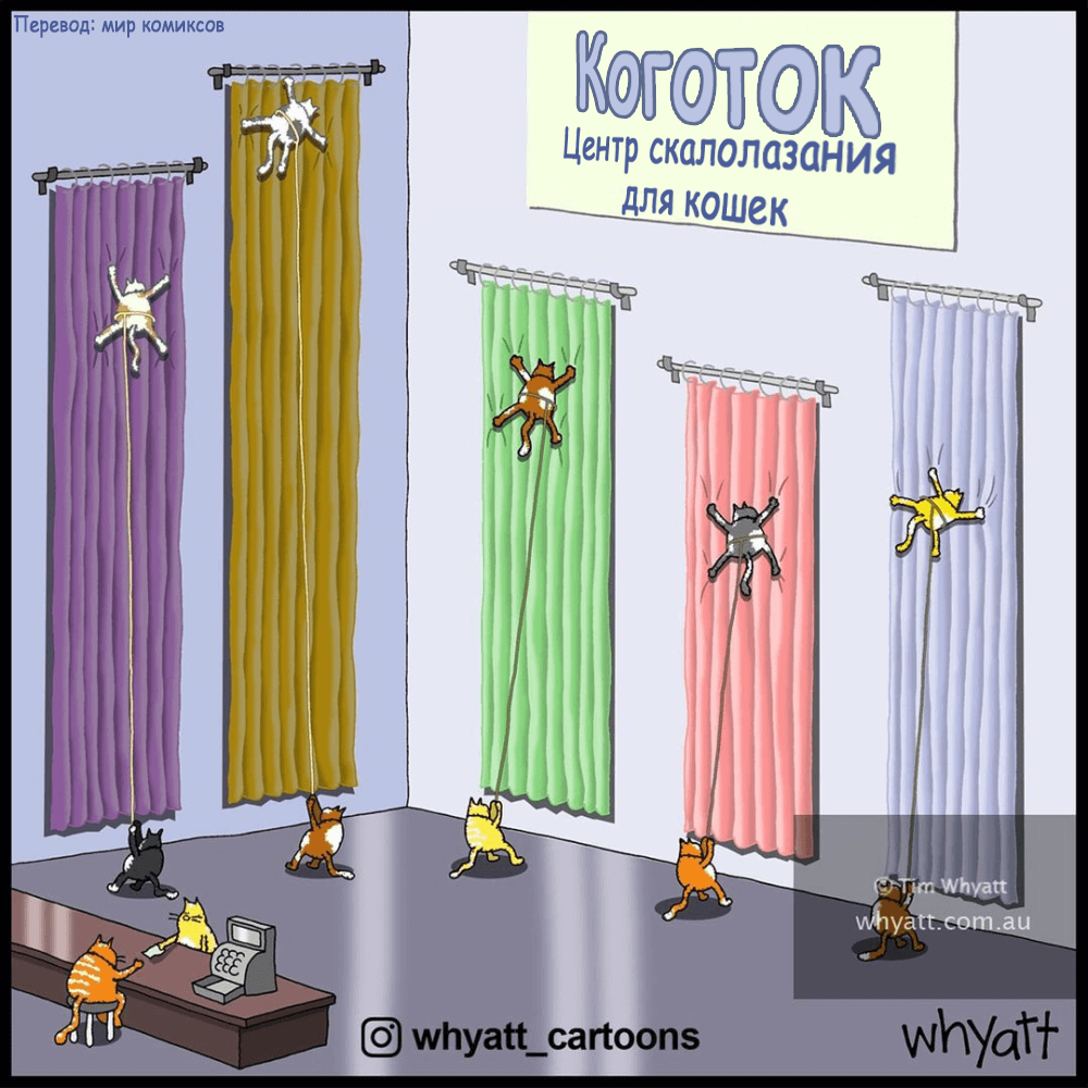 Посмотрите его комиксы и расскажите, какой из них понравился вам больше всего! Если захотите узнать больше, то можете поискать его сайт Whyatt Cartoons. А пока — улыбайтесь и не забывайте находить смешное в жизни.